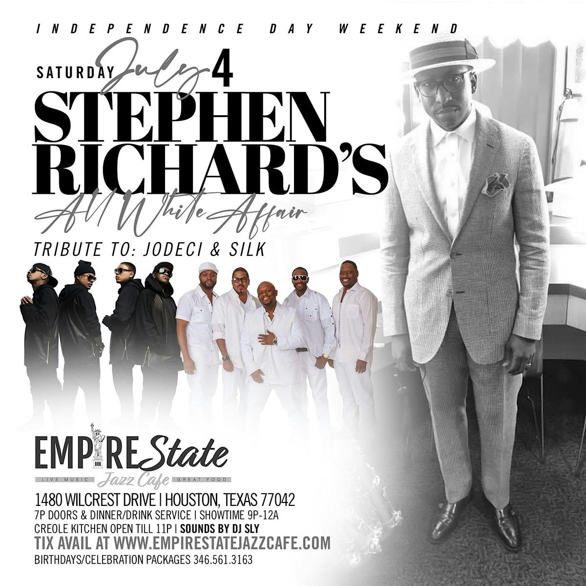 Welcome to the **7/4 - Stephen Richard All White Affair Tribute to Jodeci & SILK** event at the **Empire State Jazz Cafe**! Get ready for a night of smooth tunes and great vibes.