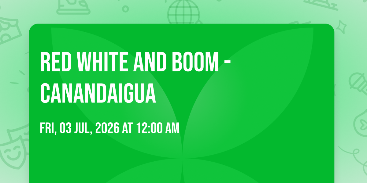 📍 Location: 42.8669, -77.2441🎉 Welcome to Red White and Boom - Canandaigua, where the impossible becomes possible and dreams take flight! 🏛️ Join us at Constellation Brands-Marvin Sands Performing Arts Center: CMAC in the heart of Canandaigua, NY for an event that will redefine your expectations. 📅 On July 3rd, 2026 at 12:00 AM, witness the transformation of space and time into something truly magical. ✨ It's a curated experience combining the best of innovation, entertainment, and community spirit, creating moments that will be remembered for years to come. Whether you're a first-time visitor or a seasoned enthusiast, prepare to be amazed. 🎊 Book now to ensure your place in this unforgettable experience!