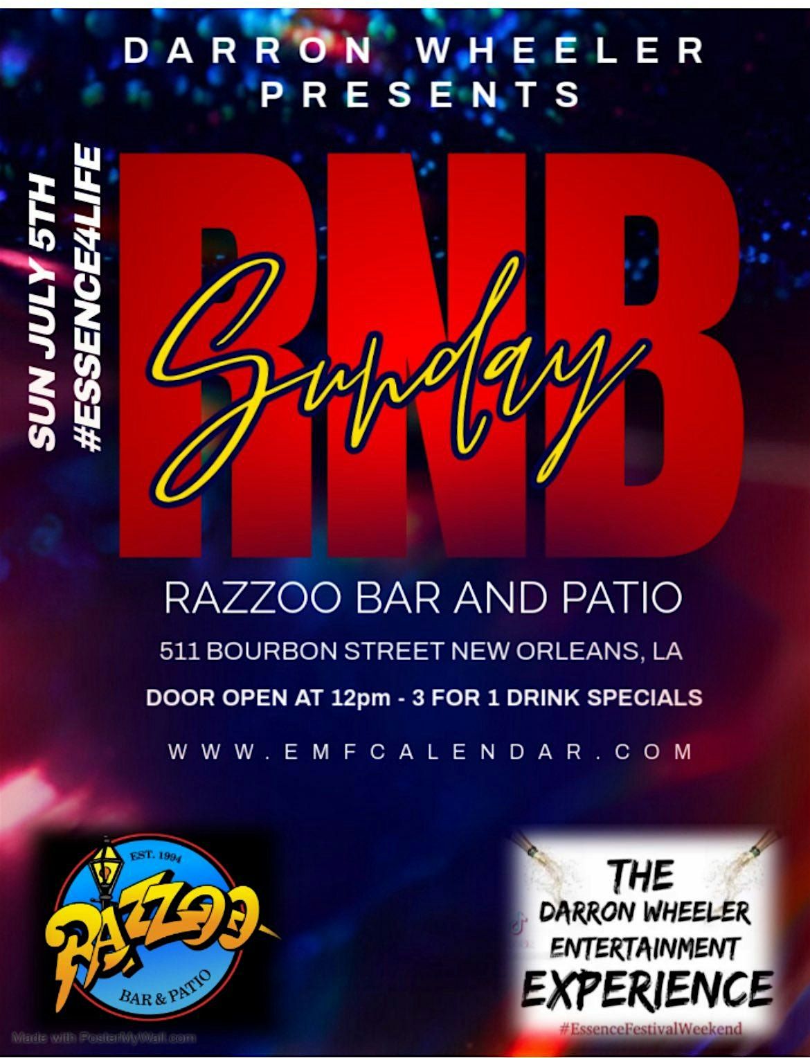 Come out and enjoy some of the Best R & B Music along with the Best Happy Hour, The Best DJ's and The Most Beautiful People who travel to New Orleans for the 4th of July Every Year. It's a Family Reunion like no other. See old friends, make new friends and party like no other party in the French Quarter. Darron Wheeler established R & B Sunday's at the World Famous Razzoo Bar and Patio your EMF'26 Party Headquarters. The venue features an In-Door Out-Door Patio, DJ's from Coast to Coast, 3 for 1 Drink Special, Live Entertainment and Host..
