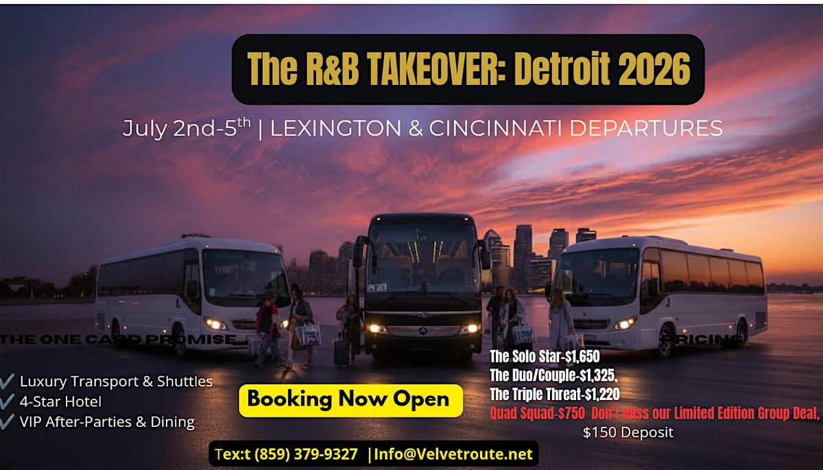 Luxury bus trip from LEX/CVG to Detroit for Usher & Breezy! 4-star hotel, VIP parties, and 4th of July BBQ included. Book your vibes now!About this Event