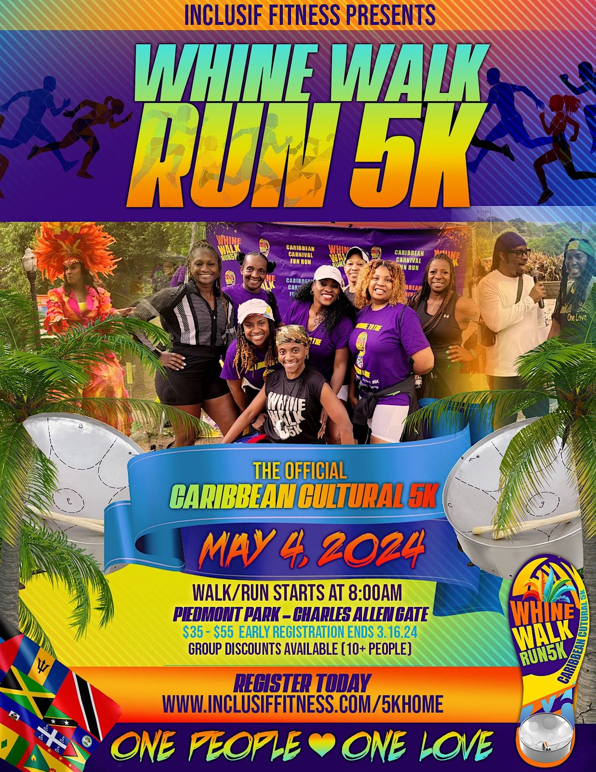 InclusiF Fitness, a wellness organization, is proud to present, Whine Walk Run 5K 2024 - an International event celebrating Caribbean culture. The Caribbean is considered to be one of the most vibrant places in the world, so our goal is to infuse the sights and sounds of the islands with a 5K. Our Fun Run objectives are to promote healthy living for the entire family, to share the Caribbean culture of a colorful atmosphere, liveliness, festive costumes, fun, food, music and talent and to give back to our community. Register today and we'll see you there!