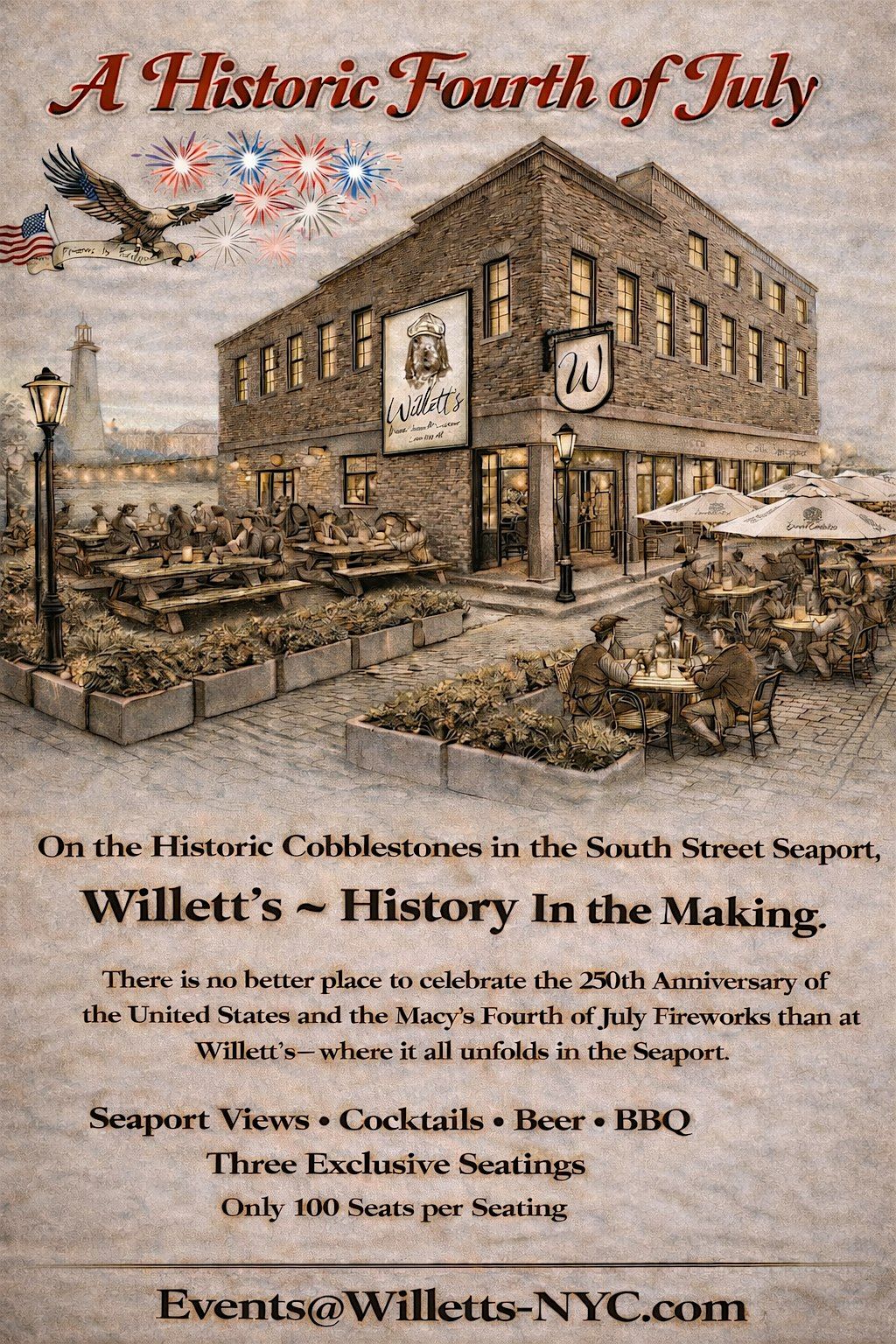 Join us for an unforgettable in-person celebration at the NYC Seaport! Celebrate the 4th of July and the nation's 250th anniversary with Willett's. Enjoy great vibes, cool company, and catch the iconic Macy's Fireworks lighting up the sky. Donβt miss out on this epic summer bash!